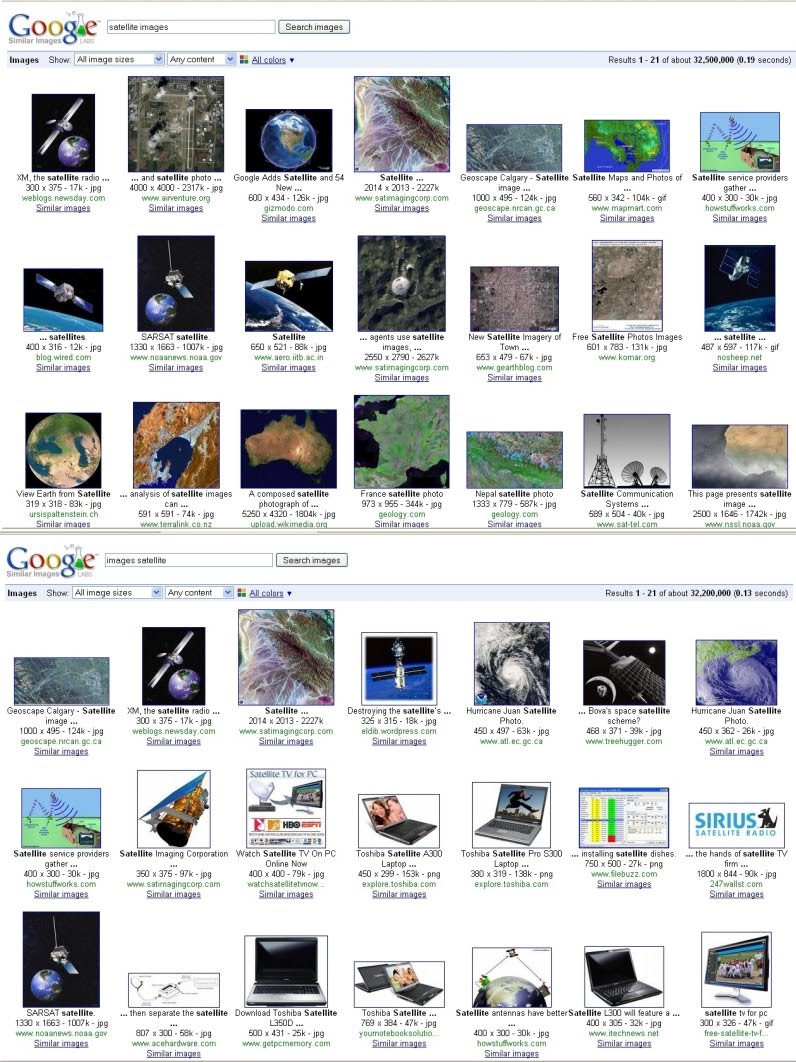 But just like Google Trends Similar Images is very sensitive to spelling or the order of the keywords entered. Thus, in the example below, depending on whether one takes "satellite images" (above) or "satellite images" (bottom), results may differ materially.